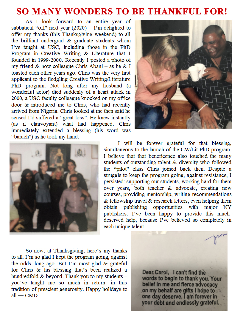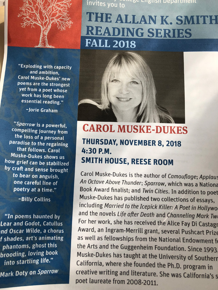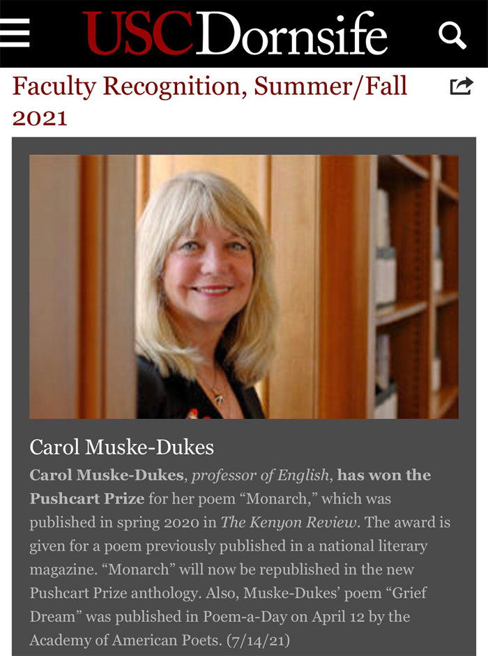 CAROL MUSKE-DUKES is now officially retired from USC, after over thirty years as a full professor with tenure and solo founder of the PhD program in Creative Writing/literature. Glad to be free!