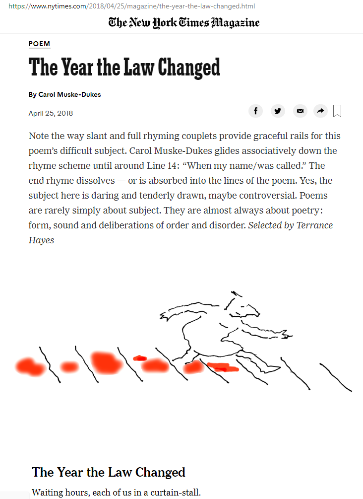 Note the way slant and full rhyming couplets provide graceful rails for this poem's difficult subject. Carol Muske-Dukes glides associatively down the rhyme scheme until around Line 14: "When my name/was called." The end rhyme dissolves - or is absorbed into the lines of the poem. Yes, the subject here is daring and tenderly drawn, maybe controversial. Poems are rarely simply about subject. They are almost always about poetry: form, sound and deliberations of order and disorder. Selected by Terrance Hayes