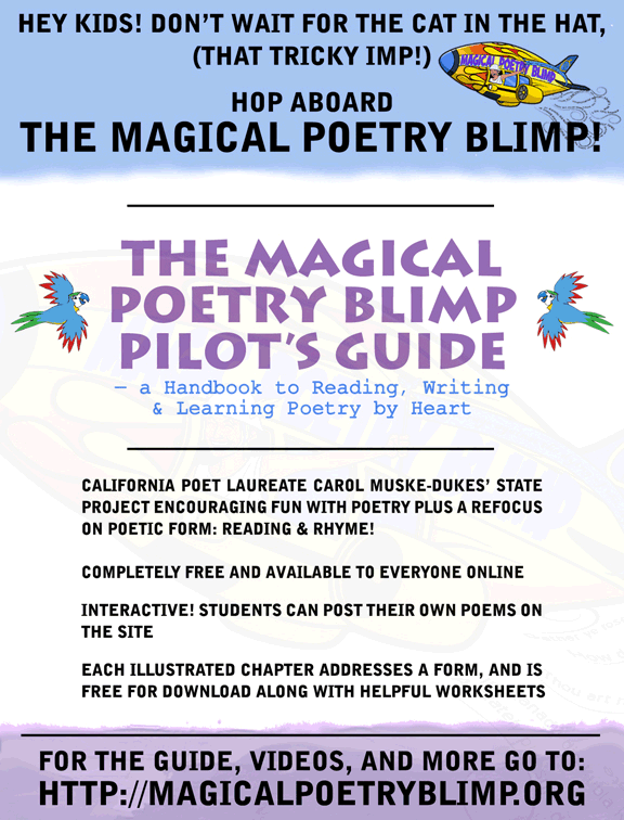 Though I've stepped down as California Poet Laureate - I am still committed to The Magical Poetry Blimp (and GET LIT/Words Ignite)! Please help The Blimp fly high with our continuing projects -- provide a tax-deductible donation: