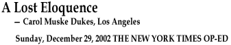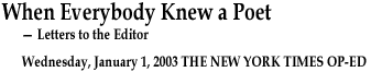 She is 85, a member of perhaps the last generation of Americans who learned poems and orations by rote in classes dedicated to the art of elocution. This long-ago discredited pedagogical tradition generated a commonplace eloquence among ordinary Americans who knew how to (as they put it) "quote." Poems are still memorized in some classrooms but not "put to heart" in a way that would prompt this more quotidian public expression. Thus my mother, who grew up on the prairie of North Dakota during the Great Depression, spent time in high school memorizing the great thoughts and music of the ages. She never forgot these poems and managed to regale all who would listen (mostly her husband and children), and by virtue of this word-hoard was able to effortlessly (almost eerily) produce a precise appropriate quote for any oc-casion. Often social or familial failings inspired her. For example (to me, frowning at my spinach): "How sharper than a serpent's tooth it is/To have a thankless child." Or an aside to a sibling whining in line at the bank: "They also serve who only stand and wait." For those who love poetry, the recent announcement that Ruth Lilly had donated about $100 million to Poetry magazine was a welcome boost. But to me the most illuminating aspect of this extraordinary news was not the size of the gift, but rather a subsequent revelation that the journal gets roughly 90,000 submissions a year - yet its circulation peaks at just 10,000. Literary magazine editors have pondered this kind of awkward imbalance for some time. It seems there are a lot of would-be poets out there. But it seems that many are writers who write without reading. And the power of reciting in order to share a poem or to comfort oneself with its words, seems almost unknown. |